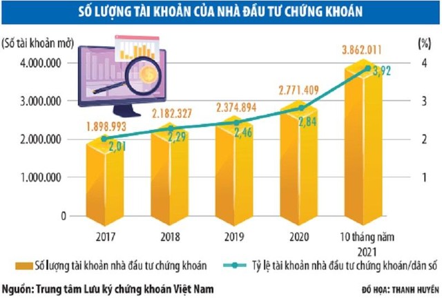 Quy mô nhà đầu tư đến cuối tháng 10/2021 đạt hơn 3,82 triệu tài khoản, tương đương 3,9% tổng dân số. Riêng trong 10 tháng đầu năm 2021, số tài khoản tăng thêm đã là 1,09 triệu đơn vị, bằng cả 4 năm trước đó cộng lại. Mục tiêu 5% dân số - từng có thời gian bị xem là khó khả thi với những bước chuyển mình chậm chạp giai đoạn trước đây - đang tiến gần hơn với tốc độ gia nhập thị trường 100.000 tài khoản mới/tháng hiện nay. Thanh khoản thị trường cũng liên tục nhảy vọt và gần đây nhất, đã xác lập kỷ lục mới hồi đầu tháng 11 với 1,9 tỷ cổ phiếu được chuyển nhượng, giá trị giao dịch gần 52.150 tỷ đồng, tương đương 2,3 tỷ USD.