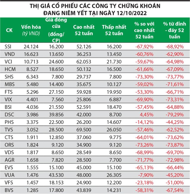 Nếu so với vùng đỉnh, nhiều mã mất 60 - 80% giá trị (xem bảng thống kê), mức giảm này thậm chí còn lớn hơn mức suy giảm khi thị trường tạo đáy giai đoạn đại dịch Covid-19 mới bùng phát. Theo Công ty Chứng khoán Agribank (Agriseco), nhóm cổ phiếu chứng khoán có độ biến động (beta) rất cao và gắn liền với diễn biến thị trường chứng khoán, vì diễn biến thị trường ảnh hưởng trực tiếp tới hoạt động kinh doanh trong kỳ. Thị trường chứng khoán giai đoạn vừa qua giảm mạnh cả về thanh khoản và điểm số nên thị giá nhóm này giảm sâu là phù hợp logic.