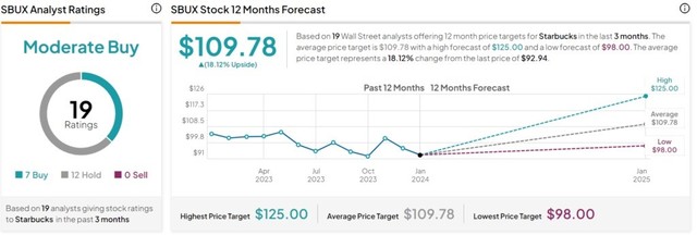 Starbucks được đánh giá mua với mức lợi nhuận bình quân là 19,83% trên mỗi xếp hạng và tỷ lệ thành công là 75%. Starbucks đang nỗ lực sự hiện diện mạnh mẽ toàn cầu, các kế hoạch mở rộng tích cực và tăng trưởng doanh số mạnh mẽ của công ty trong năm tài chính 2024 đều hướng đến sự phục hồi.