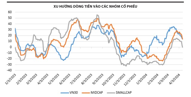 Theo dữ liệu thống kê của chúng tôi, dòng tiền tổng thể trên thị trường đang có xu thế giảm và hiện tại phân bổ nhiều nhất ở 2 nhóm vốn hóa lớn (VN30) và vốn hóa vừa (Midcap), dư địa để dòng tiền tăng thêm ở 2 nhóm này vẫn còn. Trong khi đó, nhóm vốn hóa nhỏ (Smallcap) đang tụt lại phía sau. Do vậy, nhà đầu tư nên hạn chế bỏ vốn vào các cổ phiếu vốn hóa nhỏ mà phần lớn trong số đó là các doanh nghiệp có nền tảng cơ bản kém. Đây chưa phải là pha dành cho nhóm này hoạt động mạnh.