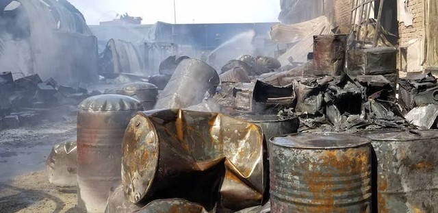 Hiện trường vụ cháy có nhiều thùng phuy đựng hoá chất.