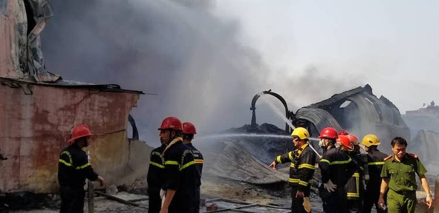Cảnh sát điều 7 xe chữa cháy cùng gần 100 cán bộ, chiến sĩ đến hiện trường dập lửa. Lúc này, nhiều tiếng nổ lớn liên tục vang lên từ bên trong nhà xưởng bốc cháy ngùn ngụt, lửa táp ra ngoài nóng bỏng khiến nhà chức trách không thể đưa vòi nước tiếp cận sâu bên trong.