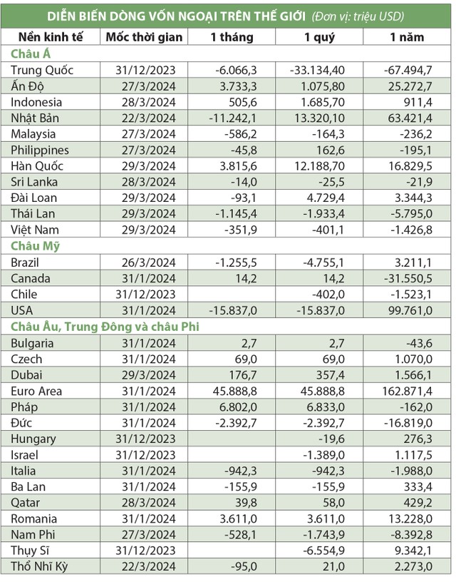 Trong bức tranh toàn cầu ngày càng biến động, dòng vốn có xu hướng dồn về các quốc gia được coi là an toàn hơn. Cụ thể, dòng vốn chảy rất mạnh vào Mỹ trong 12 tháng qua, trước khi bán ròng nhẹ gần đây. Khu vực châu Âu cũng hút tiền mạnh, nhưng dòng vốn có chọn lọc và bán ròng ở các nền kinh tế phục hồi chậm hơn mặt bằng chung như Pháp, Italia. Đối với khu vực châu Á, dòng tiền rút mạnh khỏi Trung Quốc, Thái Lan, Việt Nam và chảy vào Ấn Độ, Indonesia, Nhật Bản, Hàn Quốc, Đài Loan (Trung Quốc).