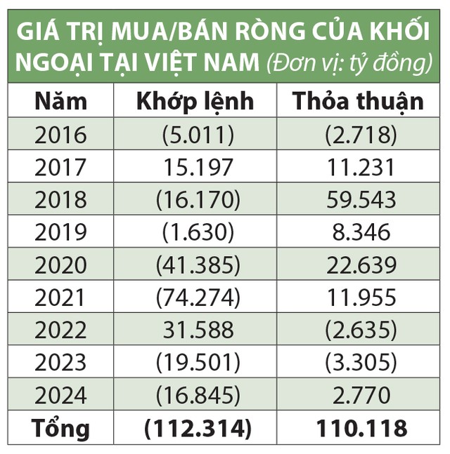 Xu hướng giao dịch thỏa thuận có sáng hơn, nhưng chủ yếu diễn ra trong giai đoạn 2017 - 2020 và tập trung vào một số cổ phiếu. Cụ thể, năm 2017, họ mua ròng 5.528 tỷ đồng cổ phiếu VRE, năm 2018 mua ròng 4.512 tỷ đồng cổ phiếu VRE, 3.400 tỷ đồng cổ phiếu NVL, 28.547 tỷ đồng cổ phiếu VHM và 11.000 tỷ đồng cổ phiếu MSN, năm 2019 mua ròng 6.000 tỷ đồng cổ phiếu VIC, năm 2020 mua ròng 5.214 tỷ đồng cổ phiếu VHM. Còn những năm gần đây, giao dịch thỏa thuận của khối ngoại không có nhiều điểm đáng chú ý, nhất là khi hình thức giao dịch này ít tác động đến thị trường như hình thức khớp lệnh.
