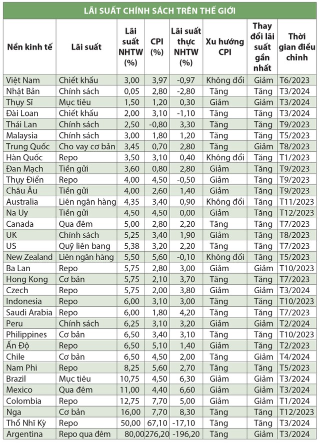 Với chính sách đi ngược để hỗ trợ kinh tế đó, Việt Nam hiện tại là một trong những quốc gia hiếm hoi có lãi suất chính sách thực âm. Trong năm nay, Cục Dự trữ Liên bang Mỹ (Fed) hoặc Ngân hàng Trung ương châu Âu (ECB) có thể đưa ra quyết định hạ lãi suất, nhưng thời điểm là khi lạm phát đã hạ nhiệt, nên lãi suất thực dương sẽ được duy trì. Có thể có lập luận là lãi suất tiết kiệm vẫn cao hơn lãi suất chính sách và thực dương cho người gửi tiền, nhưng nếu so sánh các loại lãi suất tương tự thì mức thực dương ở nhiều thị trường lớn cao hơn một cách rõ ràng.