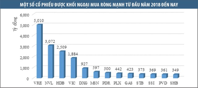 Chẳng hạn, cổ phiếu VRE của CTCP Vincom Retail, thành viên của Tập đoàn Vingroup (VIC), đang dẫn đầu danh sách mua ròng của khối ngoại từ đầu năm đến nay với 101 triệu đơn vị, tương đương 5.009 tỷ đồng. Trong khi đó, cổ phiếu Công ty mẹ VIC cũng được mua ròng 1.884 tỷ đồng trong quý I/2018. Đây là một trong những lý do chính giúp thị giá cổ phiếu VIC tăng 60% so với đầu năm (tính đến đến 23/4), qua đó vượt qua VNM trở thành cổ phiếu vốn hóa lớn nhất thị trường.