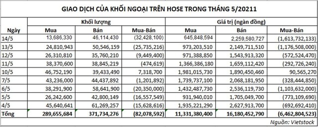 Bước sang tháng 5, cho tới nay các nhà đầu tư nước ngoài chỉ mua ròng duy nhất hôm 10/5 với giá trị rất nhỏ, hơn 90 tỷ đồng. Trong khi đó tổng khối lượng bán ròng của khối này hiện đã lên tới gần 6.500 tỷ đồng.