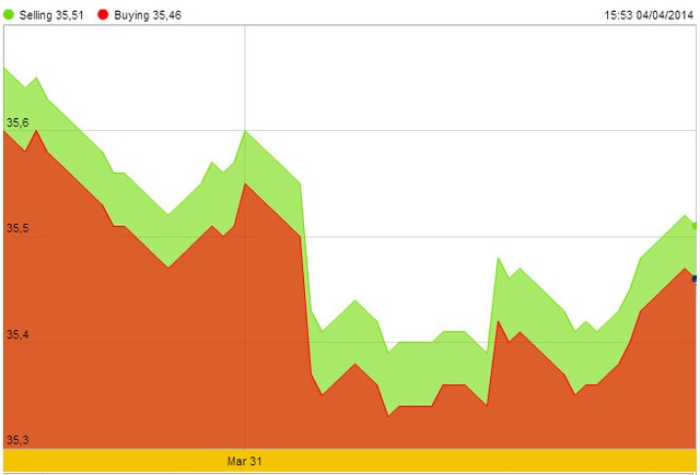 Tại thị trường trong nước, giá vàng SJC hôm nay cũng bật tăng theo giá vàng thế giới. Mức cao nhất mà vàng thương hiệu quốc gia đạt được trong ngày hôm nay là 35,47 - 35,52 triệu đồng/lượng, tăng 100.000 đồng/lượng so với chiều qua. Cuối giờ chiều, giá giảm nhẹ còn 35,46 - 35,51 triệu đồng/lượng.