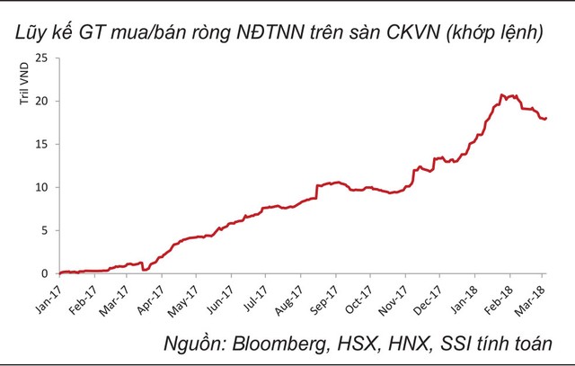 Chính vì vậy, mức độ tham gia của nhà đầu tư nước ngoài đã tăng từ mức 10 - 11% trong các năm trước lên khoảng 15% vào nửa cuối năm 2017. Chỉ riêng tháng 1/2018, nhà đầu tư nước ngoài đã mua ròng khoảng 8.000 tỷ đồng, tương đương 35% giá trị mua ròng cả năm 2017 (không tính giá trị thoái vốn Nhà nước tại SAB).