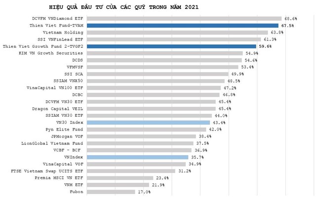 Cụ thể trong năm 2020, trung bình các qũy của TVAM đạt mức tăng trưởng 40%, vượt xa chỉ số VN-Index với mức tăng chỉ 14,9%, và gần như vượt trội tất cả các quỹ khác trên thị trường. Riêng năm 2021, TVAM đạt mức tăng trưởng bình quân 64%, đứng thứ 2 toàn thị trường, chỉ sau Qũy ETF VFMVN Diamond.