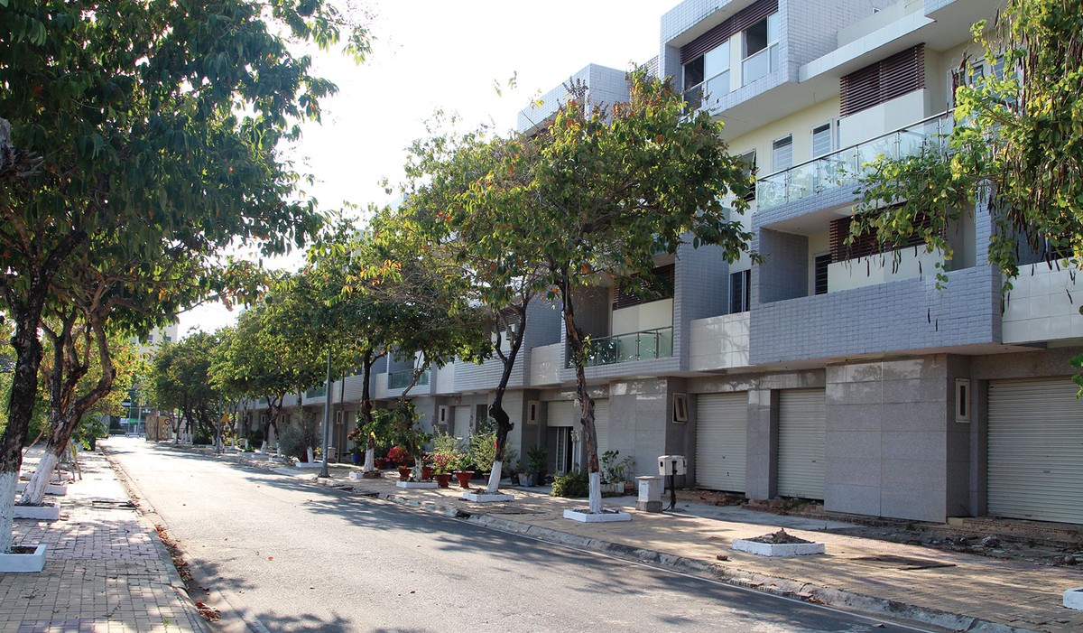 Liền kề dự án tòa nhà cao nhất Nhơn Trạch là một khu dân cư với hàng chục căn nhà cao 3 tầng đã hoàn thiện, nhưng không có người ở