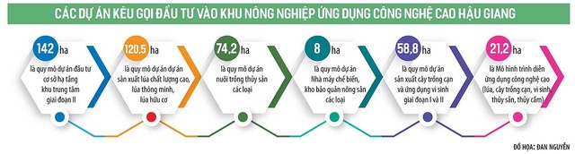Hiện tại, Khu nông nghiệp ứng dụng công nghệ cao Hậu Giang đã và đang tiếp tục đầu tư xây dựng hoàn thiện hệ thống hạ tầng giao thông, điện, thủy lợi. Tính đến nay, Khu đã thu hút được 4 nhà đầu tư thực hiện các dự án về sản xuất, chế biến nông sản, thủy sản và phân vi sinh; đầu tư xây dựng các mô hình ứng dụng công nghệ cao có tổng diện tích 310 ha, với tổng mức đầu tư là 332 tỷ đồng.