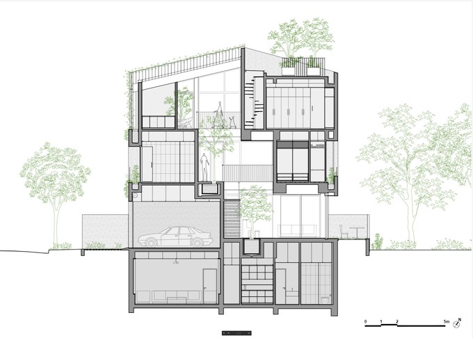 Một khoảng thông tầng lớn được tạo ra bằng một khối vuông cắt thông qua ba tầng, theo hướng chéo của mặt cắt. Ở tầng trệt, phòng khách được thiết kế theo hướng mở, giao hòa với không gian xanh ngay bên ngoài.