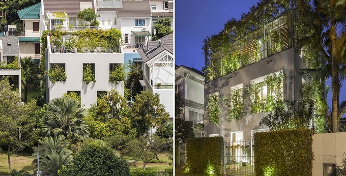 Từ khoảng thông tầng, hành lang, hay ô cửa mặt tiền, đều phủ đầy cây xanh.