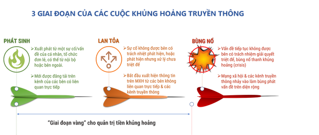 Ba giai đoạn phát triển thông thường của các cuộc khủng hoảng truyền thông gồm phát sinh, lan tỏa và bùng nổ. Các chuyên gia truyền thông cho rằng, giai đoạn vàng cho quản trị tiền khủng hoảng là từ khi phát sinh đến trước bùng nổ. Để tránh những thiệt hại lớn từ những cuộc khủng hoảng thuyền thông, doanh nghiệp cần khống chế được tình hình trong giai đoạn vàng này.