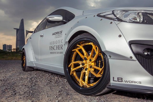 Chủ nhân bản độ tại Sài Gòn trang bị cho xe la-zăng màu vàng 5 chấu kích thước 18 inch, tương phản sắc bạc của phần thân. Hệ thống treo sử dụng phuộc thể thao mới cứng hơn.