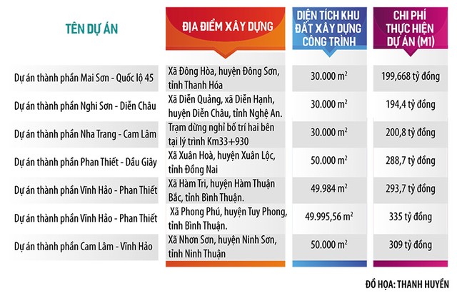 Đây là các trạm dừng nghỉ thuộc các dự án thành phần: Mai Sơn - Quốc lộ 45; Nghi Sơn - Diễn Châu; Nha Trang - Cam Lâm; Cam Lâm - Vĩnh Hảo; Phan Thiết - Dầu Giây (mỗi dự án 1 cặp trạm) và Vĩnh Hảo - Phan Thiết (2 cặp trạm).