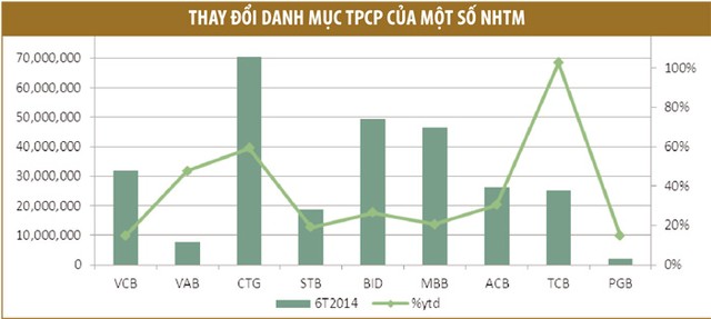 Khối ngân hàng là thành phần tham gia thị trường trái phiếu tích cực nhất. Xu hướng mở rộng danh mục TPCP được phản ánh trong báo cáo tài chính quý II/2014 của các ngân hàng. Theo đó, so với cuối năm 2013, trong tổng danh mục chung, phần đầu tư TPCP của các NHTM tăng ít nhất 15%, có ngân hàng có mức tăng đột biến 108%.
