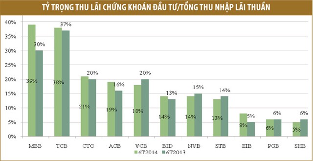 Bên cạnh đó, việc mở rộng danh mục nhanh chóng khiến phần thu nhập lãi chứng khoán đầu tư (chủ yếu là TPCP) đóng góp tỷ trọng lớn hơn vào tổng thu nhập lãi thuần của các ngân hàng trong 6 tháng đầu năm 2014. Mức tăng đáng kể nhất có thể thấy ở MBB, ngoài tốc độ mở rộng danh mục, một yếu tố nữa giúp MBB thu lãi lớn từ chứng khoán đầu tư đó là ngân hàng chú trọng hơn vào trái phiếu được Chính phủ bảo lãnh, các trái phiếu này có lợi tức cao hơn so với TPCP.