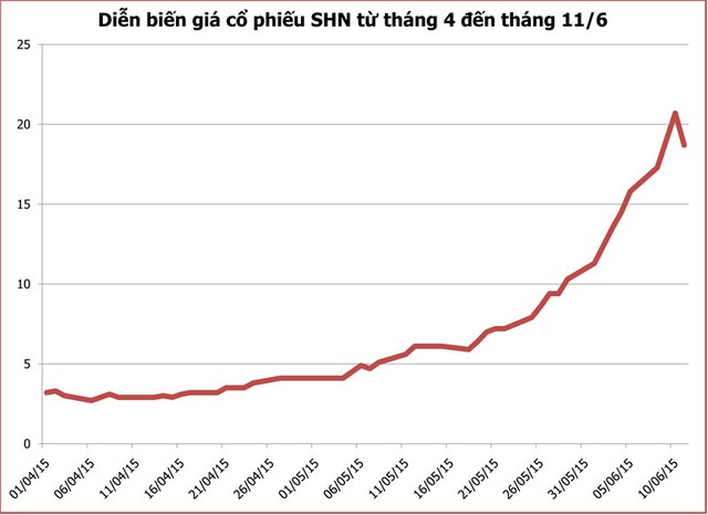 Cổ phiếu SHN của CTCP Đầu tư Tổng hợp Hà Nội trong năm 2015 đã có lúc tăng một mạch từ 2.700 đồng/cổ phiếu (tháng 4/2015) lên 20.700 đồng/cổ phiếu (10/6/2015).