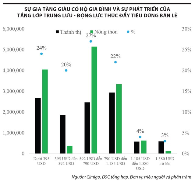 Việt Nam đang có khoảng 56% hộ gia đình có mức thu nhập trên 15 triệu đồng/tháng và sự gia tăng về tài sản hộ gia đình diễn ra tuy chậm mà chắc, với mức tăng 0,5%, trong số những người có thu nhập từ 500 - 999 USD/tháng. Ngoài ra, trong báo cáo của World Data Lab chỉ ra rằng, Việt Nam là một thị trường tiêu dùng tiềm năng lớn, được dự đoán sẽ trở thành thị trường tiêu dùng lớn thứ 11 thế giới vào năm 2030. Với dân số hơn 100 triệu người, Việt Nam dự kiến nằm trong nhóm 5 thị trường tiêu dùng tăng trưởng nhanh nhất châu Á, thu nhập trung bình đạt trên 20 USD/ngày (theo sức mua ngang giá không đổi) trong giai đoạn 2021 - 2030.