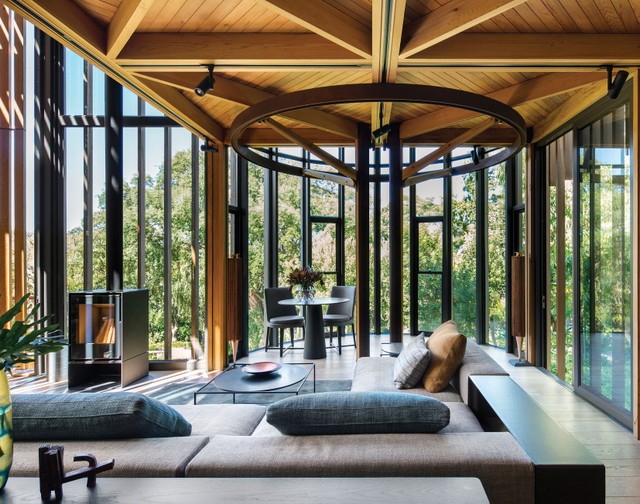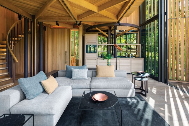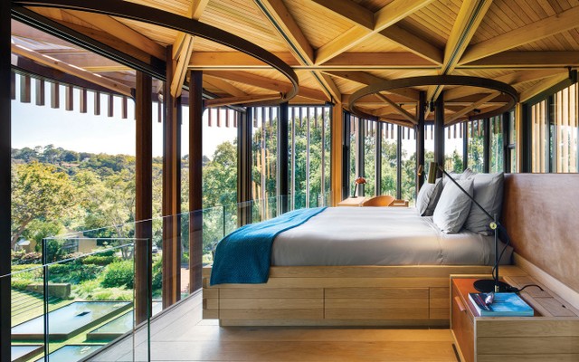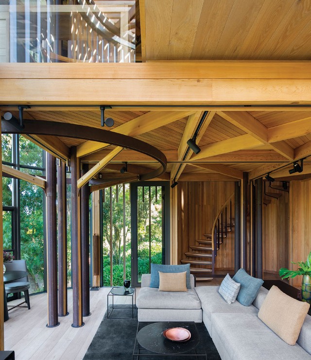 Cụ thể, ngôi nhà được xây dựng với cấu trúc vuông, nhưng tại mỗi góc được mở rộng với các hình vòng cung, vừa giúp tạo tầm nhìn thoáng đáng, vừa tạo độ mềm mại, tròn trịa như những gốc cổ thụ. Với vật liệu chính là các dầm thép và gỗ, ngôi nhà có độ chắc chắn nhưng vẫn nhẹ.