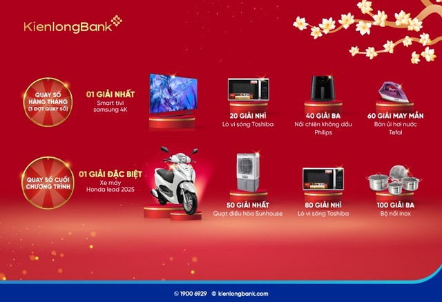 (ĐTCK) Chào đón năm 2025, từ nay đến hết ngày 28/03/2025, KienlongBank triển khai chương trình khuyến mại mang tên "Xuân tươi mới - Lộc phơi phới" với tổng giá trị giải thưởng đến 1,2 tỷ đồng. Theo đó, mỗi khách hàng gửi tiết kiệm trong thời gian này sẽ có cơ hội trúng thưởng lớn qua 2 vòng quay số giữa kỳ và cuối kỳ.