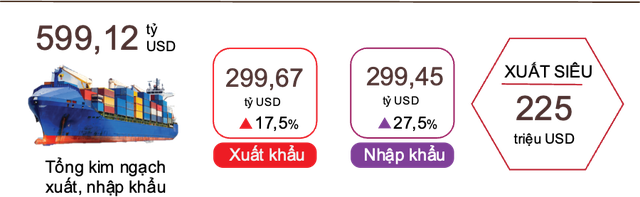 Tính chung 11 tháng, cán cân thương mại hàng hóa xuất siêu 225 triệu USD (cùng kỳ năm trước xuất siêu 20,19 tỷ USD). Trong đó, khu vực kinh tế trong nước nhập siêu 24,32 tỷ USD; khu vực có vốn đầu tư nước ngoài (kể cả dầu thô) xuất siêu 24,55 tỷ USD.