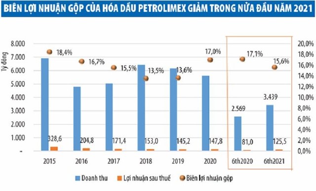 Tuy vậy, biên lãi gộp của cả 2 mảng kinh doanh này lại sụt giảm đáng kể trong bối cảnh giá dầu tăng mạnh, giá bán đầu ra dù cũng có xu hướng tăng, nhưng không đủ bù đắp mức tăng của giá nguyên vật liệu. Biên lợi nhuận gộp của mảng dầu nhờn đã giảm còn 28,62%, từ mức 32,89% trong nửa đầu năm 2020. Biên lợi nhuận gộp mảng hóa chất giảm còn 5,51%, từ mức 9,38% cùng kỳ năm ngoái.