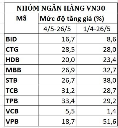 Số liệu thống kê (bảng trên) cho thấy, kể từ ¼ đến hết phiên giao dịch 26/5, có tới 7/9 cổ phiếu ngân hàng trong rổ VN30 đã có mức tăng trên 20%, trong đó ngôi vương thuộc về cổ phiếu VPB của ngân hàng VPBank.