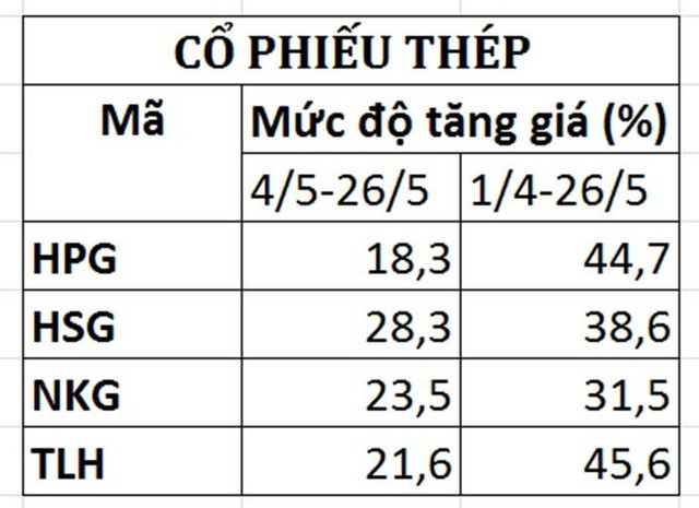 Đà tăng giá của thép trên thị trường quốc tế và trong nước cùng với sự thăng hoa của thị trường chứng khoán Việt Nam đã thúc đẩy đà tăng của các cổ phiếu ngành thép (bảng dưới).