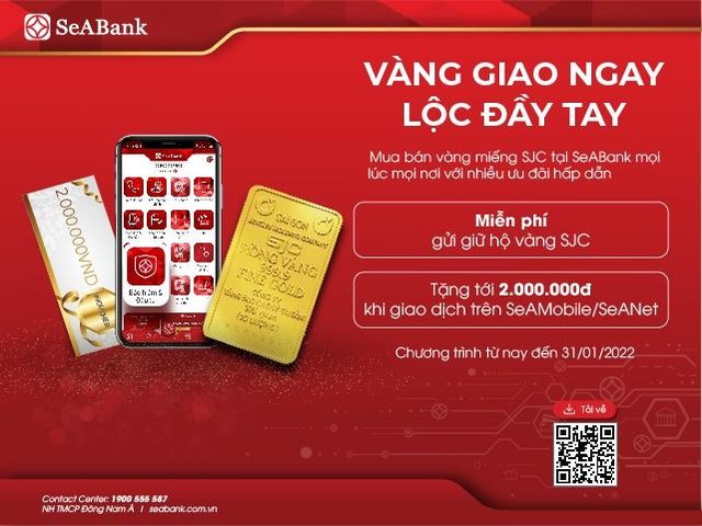 Không chỉ vậy, để khuyến khích mua và gia tăng lợi ích cho khách hàng, SeABank triển khai nhiều chính sách ưu đãi như: dành tặng 100.000 đồng cho 99 khách hàng đầu tiên giao dịch mua/bán vàng miếng SJC trực tuyến; dành tặng 20 phần quà “Big Deal” (gồm 400.000 đồng tiền chuyển khoản và eVoucher 600.000 đồng cho lần mua bán vàng trực tuyến tiếp theo) cho khách hàng mua/bán vàng SJC tối thiểu 20 lượng vàng/giao dịch trực tuyến nhanh nhất và rất nhiều quà tặng eVoucher trị giá từ 200.000 - 1.000.000 đồng cho các khách hàng giao dịch vàng trực tuyến tại SeABank.