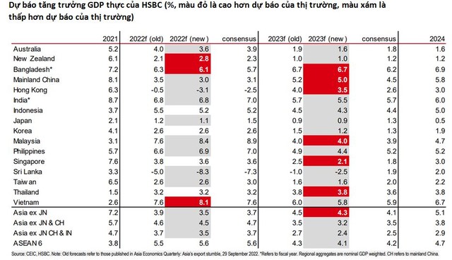Tuy nhiên, HSBC cho rằng, tác động của những biến động trong năm 2022 sẽ còn tiếp tục ảnh hưởng lên tăng trưởng trong thời gian tới. Chính sách tiền tệ thắt chặt ảnh hưởng đến các quyết định đầu tư dù chậm trễ; người tiêu dùng phải giảm chi tiêu khi giá cả tăng lên kìm hãm sức mua và xuất khẩu sẽ bị ảnh hưởng do đơn hàng sụt giảm khắp nơi.