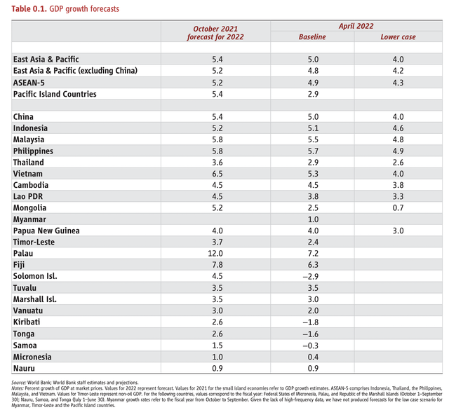 Mặc dù những quốc gia sản xuất hàng hóa hoặc có chính sách tài khóa thận trọng có thể được trang bị tốt hơn để đương đầu với những cú sốc này, nhưng tác động dội của những sự kiện này sẽ làm triển vọng tăng trưởng của hầu hết các quốc gia trong khu vực xấu đi. Tăng trưởng kinh tế được dự báo đạt tốc độ 5% trong năm 2022 - giảm 0,4 điểm phần trăm so với dự báo hồi tháng 10/2021. Nếu tình hình toàn cầu xấu đi và các quốc gia có các chính sách ứng phó yếu ớt, tăng trưởng có thể giảm chỉ còn 4%.
