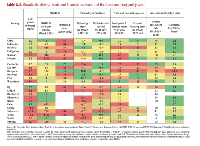 Những quốc gia có nợ lớn - như Cộng hòa Dân chủ Nhân dân Lào và Mông Cổ - hoặc phụ thuộc nhiều vào xuất khẩu - như Malaysia và Việt Nam - đang có nguy cơ với các cú sốc về tăng trưởng và tài chính toàn cầu.