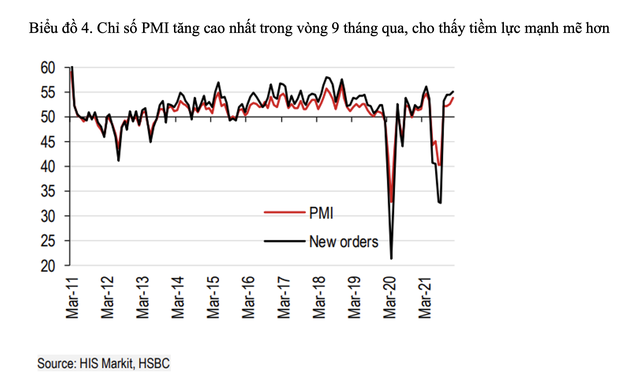 Ngoài ra, chỉ số PMI tăng cao nhất trong vòng 9 tháng qua cho thấy dấu hiệu sản lượng công nghiệp mạnh mẽ trở lại. Hầu hết các chỉ số chi tiết chính đều thể hiện sự phục hồi bền vững, dự báo một viễn cảnh lạc quan về tình hình sản xuất sẽ lấy lại phong độ như thời điểm trước COVID-19.