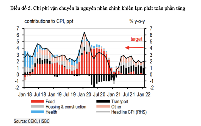 Vì vậy, HSBC tăng nhẹ dự báo mức lạm phát bình quân của năm 2022 lên 3% so với mức dự báo trước đây là 2,7%. Mức này cũng không cho thấy một rủi ro đáng kể cho Ngân hàng Nhà nước Việt Nam (NHNN) vì vẫn còn thấp hơn mức lạm phát mục tiêu 4% của Chính phủ.