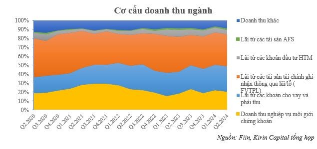 Đóng góp lớn nhất cho hoạt động toàn ngành vẫn đến từ hai hoạt động kinh doanh chính là tự doanh và cho vay ký quỹ, khi lần lượt chiếm tỷ trọng trong cơ cấu doanh thu là 42,16% và 28,44%.