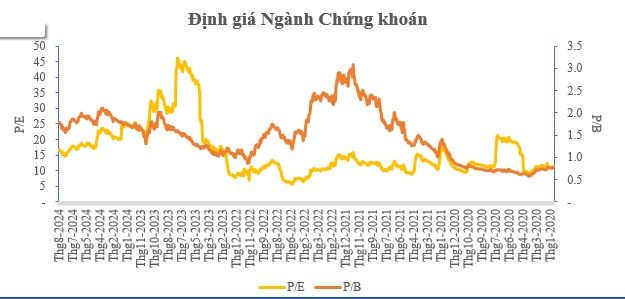 Bên cạnh đó, ngành chứng khoán vừa trải qua một giai đoạn tăng trưởng hết sức tích cực và ở thời điểm hiện tại, theo định giá P/E và P/B của toàn ngành đã không còn rẻ, khi ghi nhận tại ngày 27/08/2024 đạt lần lượt là 16,2 và 1,77.