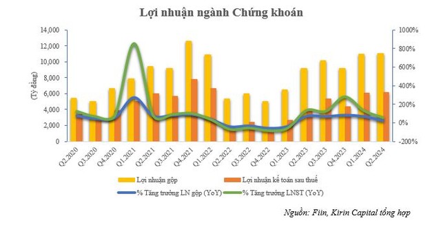 Lợi nhuận sau thuế ngành Chứng khoán trong quý II cũng duy trì xu hướng tăng trưởng mạnh mẽ khi đạt 6.121,5 tỷ đồng, tăng 54,7% so với cùng kỳ và tăng nhẹ 0,29% so với quý I/2024.