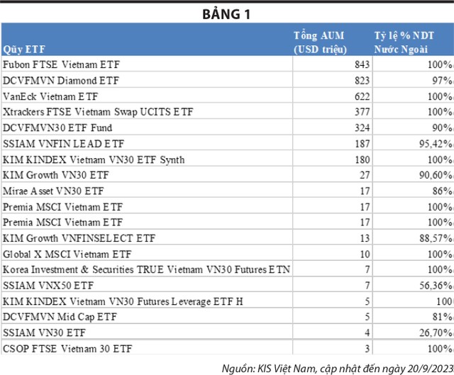 Hiện TTCK Việt Nam có khoảng 20 quỹ ETF nội, ngoại với tổng tài sản quản lý (AUM) gần 3,5 tỷ USD, còn rất nhỏ so với vốn hoá sàn HOSE. Đáng chú ý, hầu hết nhà đầu tư tham gia các quỹ ETF này là nhà đầu tư nước ngoài (trên 95%). (bảng 1)