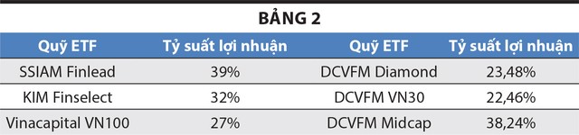 Với đặc thù đầu tư vào ETF Việt Nam là đầu tư vào rổ cổ phiếu của các doanh nghiệp hàng đầu trên TTCK, nên nhà đầu tư sẽ hưởng lợi từ tăng trưởng chung của nền kinh tế, cũng như doanh nghiệp đầu ngành, mà không mất thời gian nghiên cứu, phân tích chi tiết. (bảng 2)
