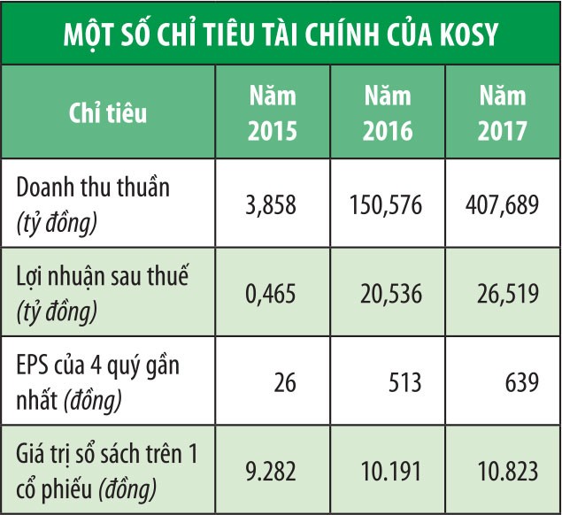 Theo báo cáo tài chính hợp nhất năm 2017 vừa được công bố, doanh thu bán hàng và cung cấp dịch vụ của Kosy đạt 407,6 tỷ đồng, tăng 170%; lợi nhuận sau thuế đạt 26,5 tỷ đồng, tăng gần 30% so với năm 2016. Trước đó, năm 2016, kết quả kinh doanh của Kosy tăng trưởng mạnh so với năm 2015.