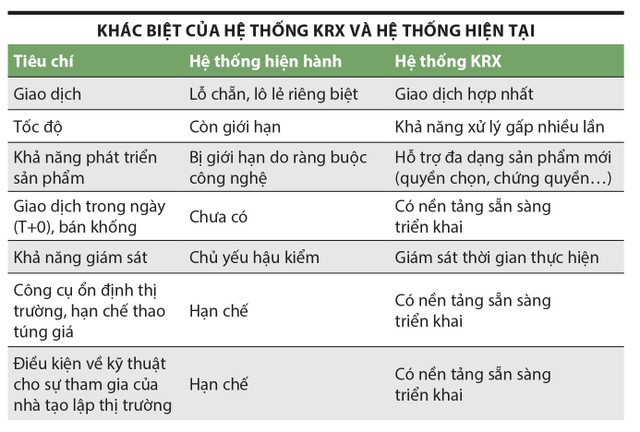 KRX ra đời có thể gỡ bỏ hầu hết những hạn chế đó. Với năng lực tích hợp nhiều thị trường (thị trường cổ phiếu, trái phiếu, phái sinh) trong một nền tảng, kết nối linh hoạt giữa các chủ thể, giao dịch gần như theo thời gian thực, thời gian thanh toán được rút ngắn, đồng thời bổ sung các chức năng giám sát và ổn định thị trường hiện đại, hệ thống này tạo ra không gian phát triển mới cho nhiều loại hình sản phẩm và dịch vụ tài chính, nâng cao chất lượng và hiệu quả, từ đó giúp thị trường tiến dần đến trạng thái phát triển bền vững hơn.
