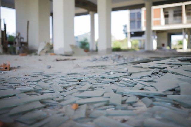 Nhiều mảnh kính vỡ trên nền sàn các dãy nhà.