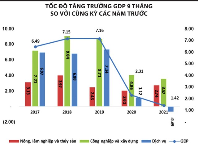GDP 9 tháng chỉ tăng 1,42% so với cùng kỳ 2020. Con số này không gây nhiều bất ngờ, bởi suốt quý III, dịch bệnh Covid-19 bùng phát trên diện rộng đã ảnh hưởng nặng nề đến các doanh nghiệp tại đầu tàu kinh tế phía Nam.