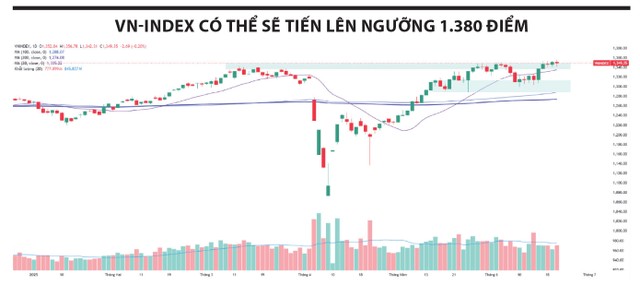VN-Index đã bật tăng trở lại sau chuỗi phiên kiểm định ngưỡng hỗ trợ 1.300 điểm, cho thấy xu hướng hồi phục đang được duy trì. Dù đà tăng chững lại khi tiệm cận vùng đỉnh cũ quanh 1.350 điểm - đặc biệt với biến động mạnh vào cuối tuần trong bối cảnh hợp đồng tương lai tháng 6 trên sàn phái sinh đáo hạn và các quỹ cơ cấu danh mục, chỉ số vẫn giữ được trạng thái tích cực nhờ sự luân phiên dẫn dắt của nhóm cổ phiếu vốn hóa lớn. Trong ngắn hạn, diễn biến giằng co có thể tiếp diễn vào đầu tuần này, nhưng xu hướng tăng nhiều khả năng sẽ được nối dài, với kỳ vọng hướng tới vùng kháng cự tiếp theo quanh 1.380 điểm.