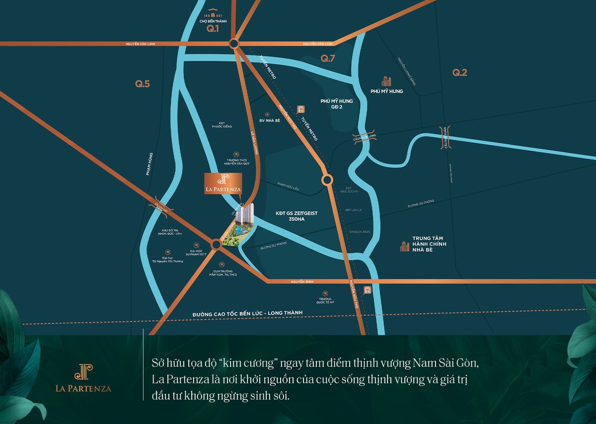 La Partenza tọa lạc tại trục đường “huyết mạch” Lê Văn Lương, Nhà Bè - vị trí chiến lược kết nối vùng tương lai của Nam Sài Gòn, liền kề KĐT Phú Mỹ Hưng quy mô 460ha, KĐT Zeitgeist Nhà Bè quy mô 350ha và hàng loạt các khu công nghiệp lớn, trung tâm thương mại, tài chính ngân hàng, hệ thống trường học, y tế, giáo dục, bệnh viện, nhà hàng, tổ hợp vui chơi giải trí hiện đại,...