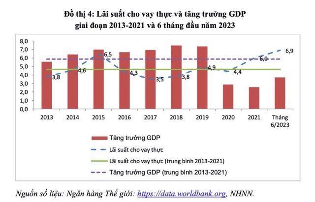Thứ ba, lạm phát giảm mạnh là do lãi suất thực ở mức quá cao. Theo công bố của Ngân hàng Nhà nước, lãi suất cho vay bình quân đến giữa tháng 6/2023 là 8,9%. Với lạm phát so với cùng kỳ hiện nay đang ở mức 2%, mức lãi suất cho vay thực là 6,9%/năm, cao hơn tốc độ tăng trưởng GDP cũng như mức lãi suất thực trung bình của giai đoạn 2013-2021 là 5,9% và 4,6%. Đây là mức lãi suất cản trở phục hồi kinh tế và tăng trưởng, làm giảm tổng cầu đồng thời làm tăng nợ xấu.