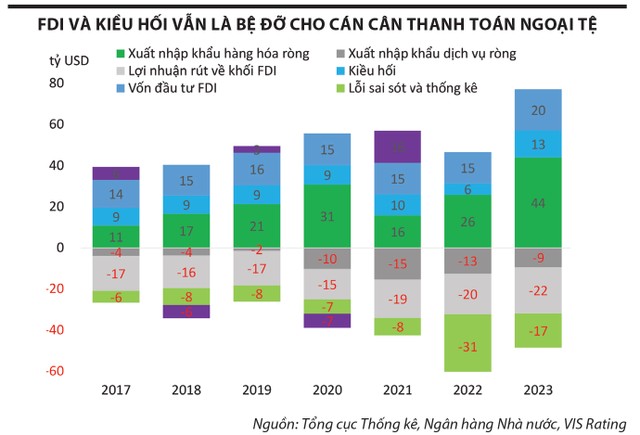 Về cung cầu ngoại tệ trên thị trường, các nguồn ngoại tệ chảy vào Việt Nam trong năm 2024 vẫn được kỳ vọng sẽ duy trì ổn định, đặc biệt là ở phần vốn đầu tư nước ngoài (FDI) và kiều hối gửi về Việt Nam. Trong năm 2023, nền kinh tế Việt Nam có mức xuất siêu hàng hóa rất cao (44 tỷ USD) chủ yếu do phía nhập khẩu hàng hóa nguyên liệu đầu vào cho hoạt động sản xuất giảm mạnh. Năm 2024, mức xuất siêu hàng hóa sẽ giảm đi, tuy nhiên về tổng thể nền kinh tế Việt Nam vẫn tiếp tục duy trì trạng thái xuất siêu với sự đóng góp chủ yếu của khối FDI.